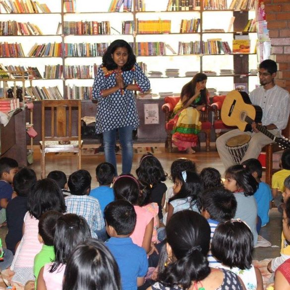 Priya, with her background in story telling and Ganesh with a passion for music thought it would be great to come together to create an different experience for the kids/participants. They put their idea to action and found this combination to be a roaring success, received with great enthusiasm by kids and parents. They find that combining different elements gives a whole new experience to the stories and the message they carry. She has been featured as one of the innovators making a conscious living in the 52 Parindey project series.